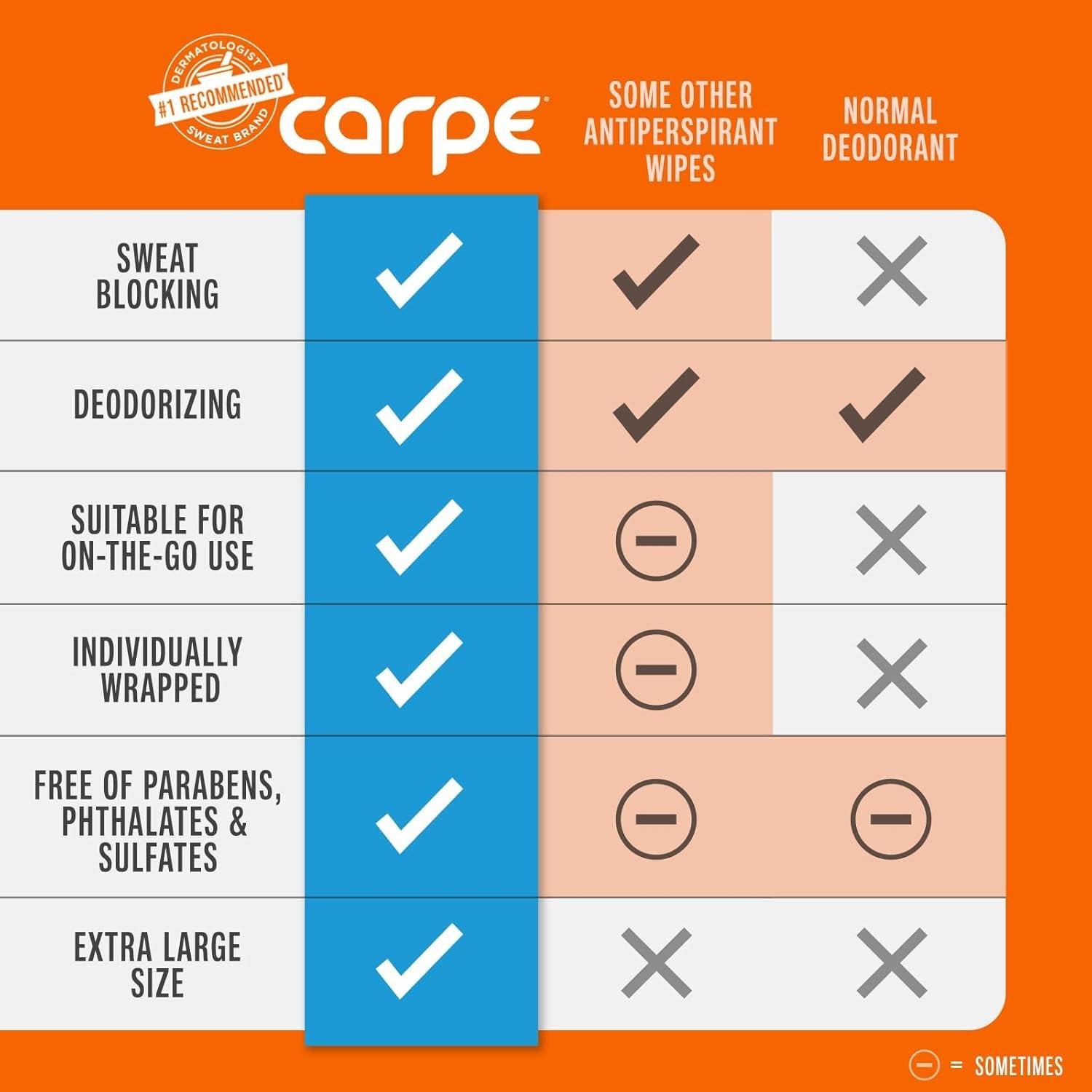 SWEAT RELIEF WHEN YOU’RE ON-THE-GO: Most antiperspirants are designed for application at night and in the morning, but not once you’ve left the house. Carpe On-The-Go Wipes are the first antiperspirant for men and women to be used during the day when you’re already sweaty and on the move. Take the convenient single use pouches with you wherever you go, then wipe the sweat off, and keep it off anytime, anywhere.