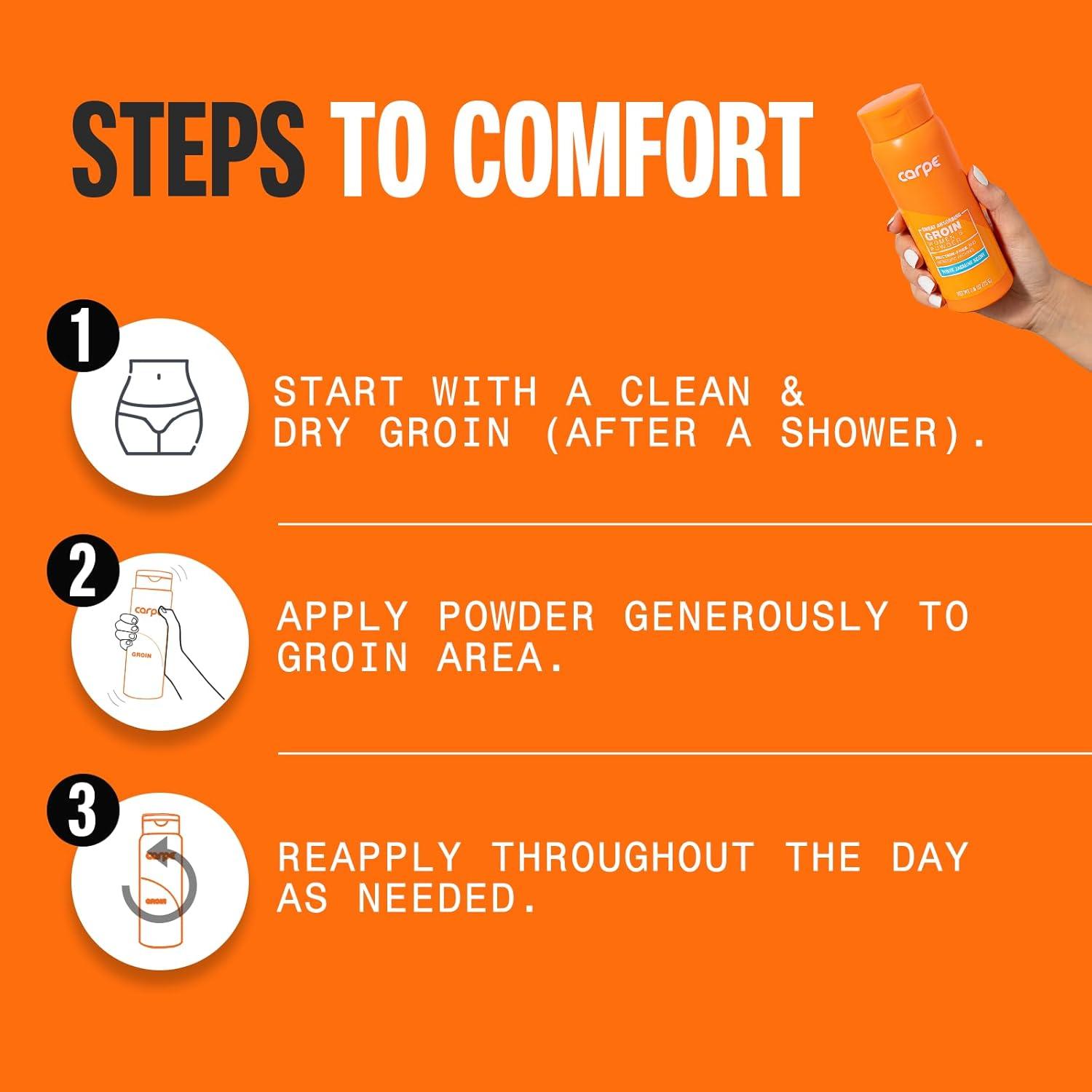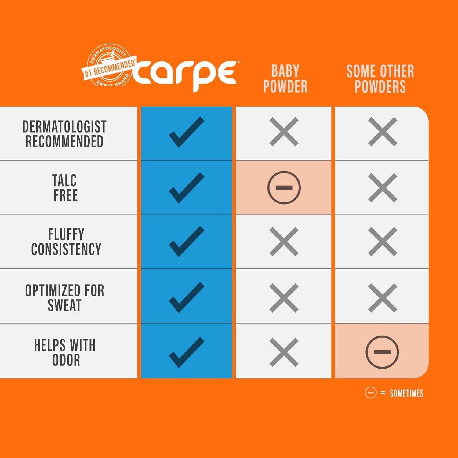 DON'T SWEAT IT: Carpe's sweat absorbing groin and body powder for women is vegan and free from parabens, phthalates, formaldehydes, sulfates, and talc. Filled in the USA with global components.