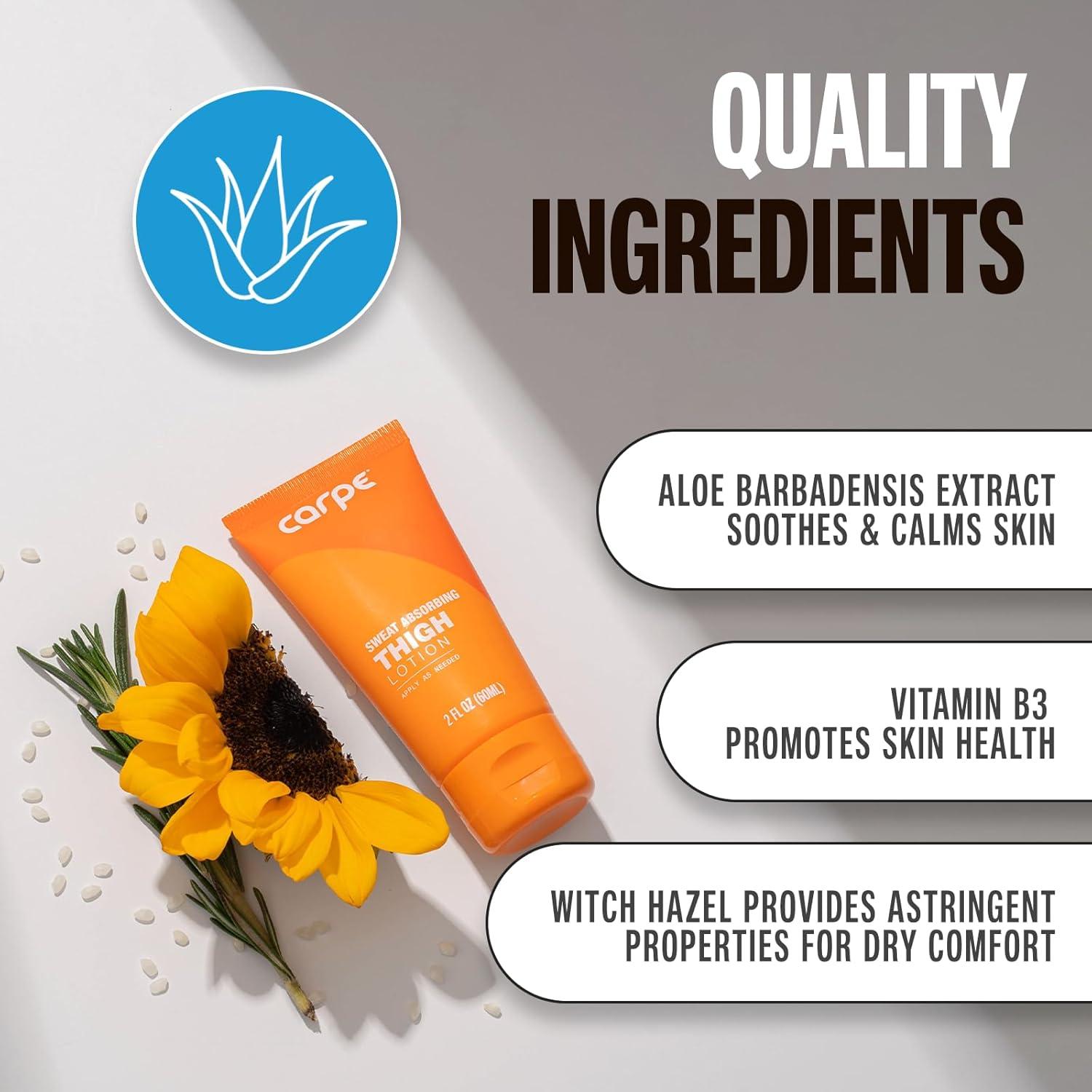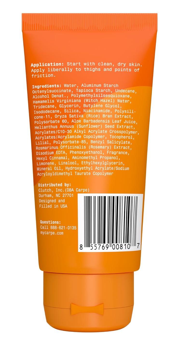 REPLACE YOUR ANTI CHAFE STICK AND BALM – Carpe's sweat absorbing, quick-drying lotion is designed to keep your thighs from sticking together and chafing. Say goodbye to rough rubbing, redness, and irritation – say hello to smooth, dry confidence.
