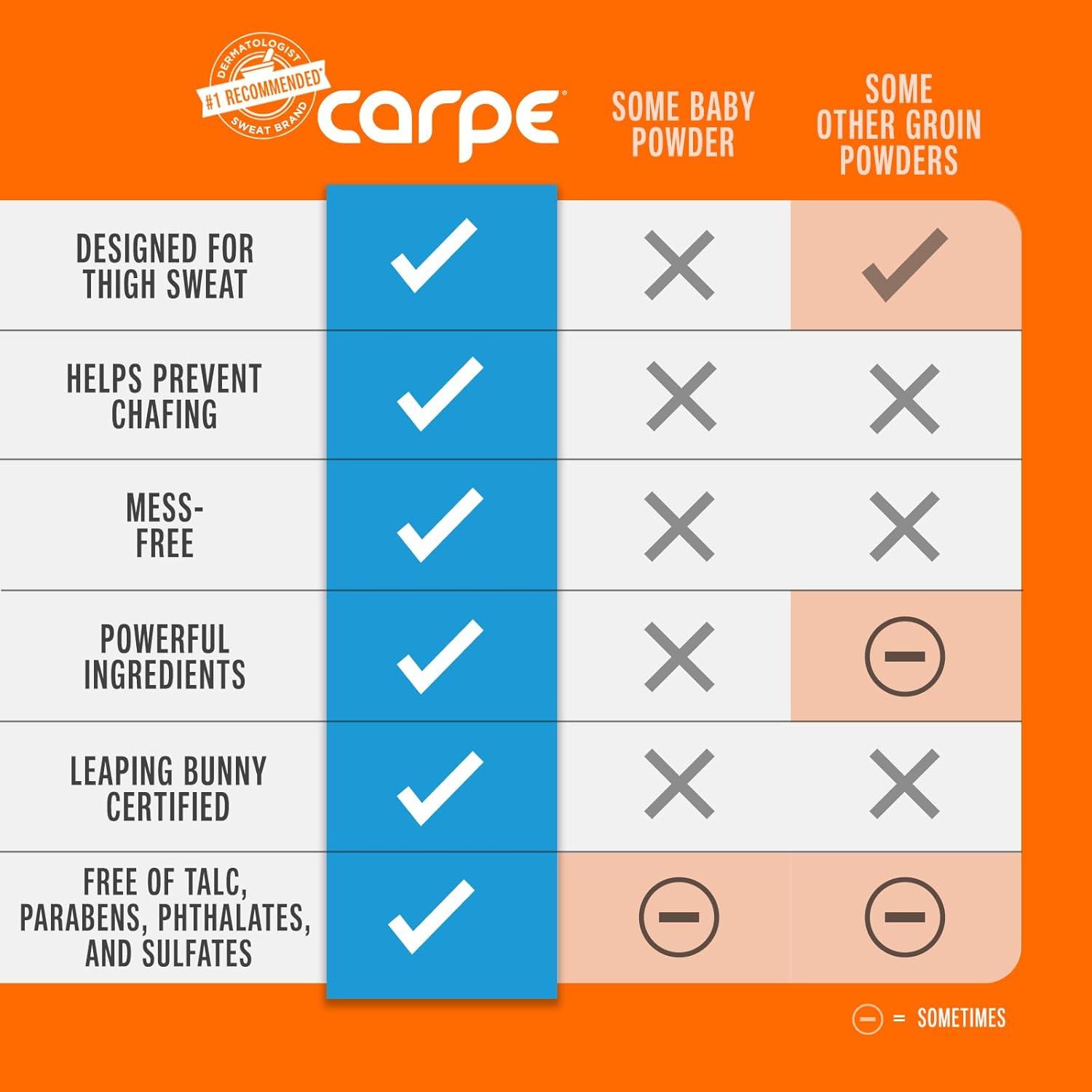 CONTROLS EMBARRASSING AND UNCOMFORTABLE THIGH SWEAT – Don’t let the wet, swampy feeling of sweaty inner thighs ruin your day. Say goodbye to unwanted moisture, chafing caused by friction, and constant itching. The Carpe thigh rescue formula is your defender of dry, comfortable, and smooth thighs.