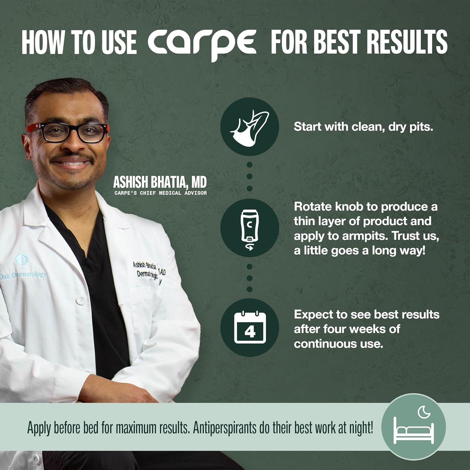 EASY TO USE ANTIPERSPIRANT DEODORANT: With a thin layer of Carpe Antiperspirant Lotion you can reduce sweat with safe and effective ingredients. Apply our sweat control deodorant before bed for best results and say goodbye to your armpit sweat & smelly underarms without the downsides of prescription oral treatments or iontophoresis.