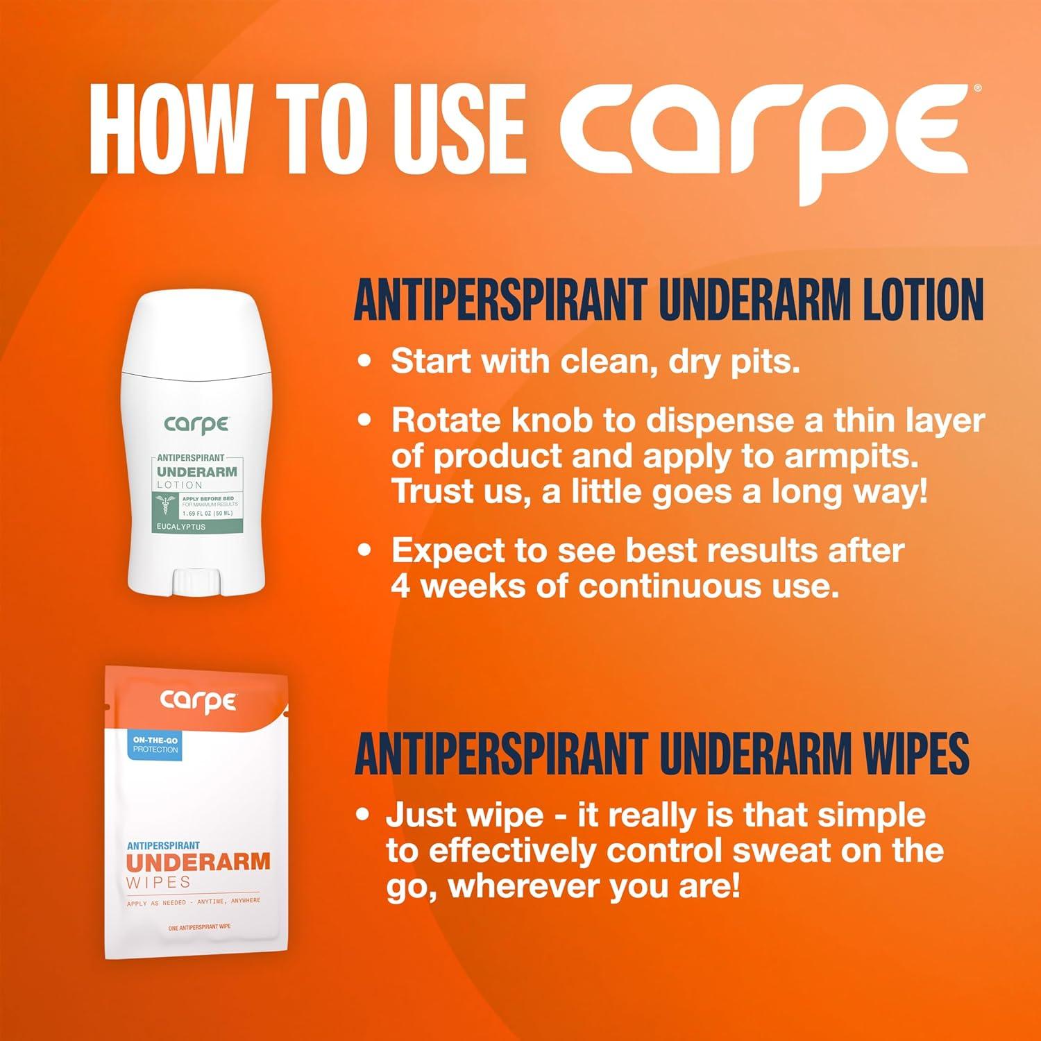 EASY TO USE: With a pea sized amount of Carpe Antiperspirant Lotion you can instantly reduce sweat without side effects. Apply daily for best results and say goodbye to your sweaty, smelly underarms without having to suffer from the side effects associated with other solutions.
